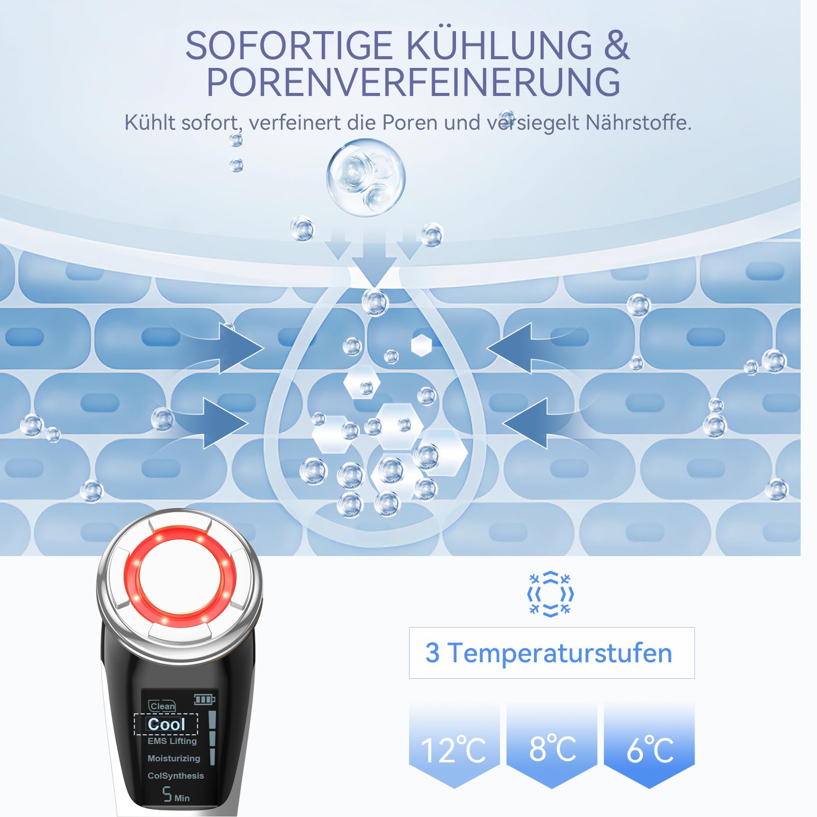 - 【Masajeador facial caliente y frío】 1. Modo frío: 6-12°C con tres controles de temperatura, ayuda a reducir los poros, bloquea los nutrientes y la humedad de la piel, calma la hinchazón, el contorno firme, hace que la piel sea delicada y elástica. 2. Modo caliente: 38-42 ° C, masaje tibio, ayuda a abrir rápidamente los poros, promueve la circulación sanguínea, absorbe completamente los nutrientes y despierta la vitalidad de la piel.