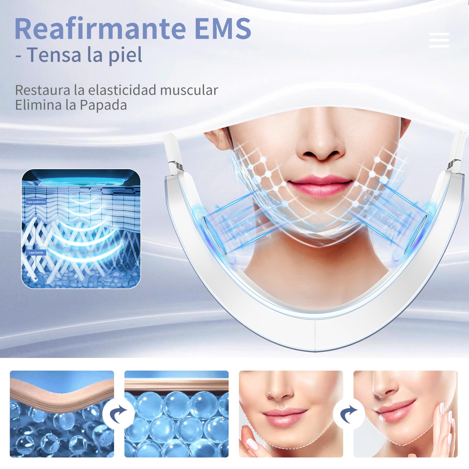 - Instrumento facial lifting en forma de V de cuatro agujas: Este Reductor de Papada utiliza estimulación de microcorriente para reafirmar la piel. La energía se distribuye uniformemente por todo el rostro, brindando confort. Ayuda a restaurar la elasticidad muscular y a atenuar la papada. El instrumento facial ofrece modos como amasamiento, rodamiento, acupuntura y palmaditas.