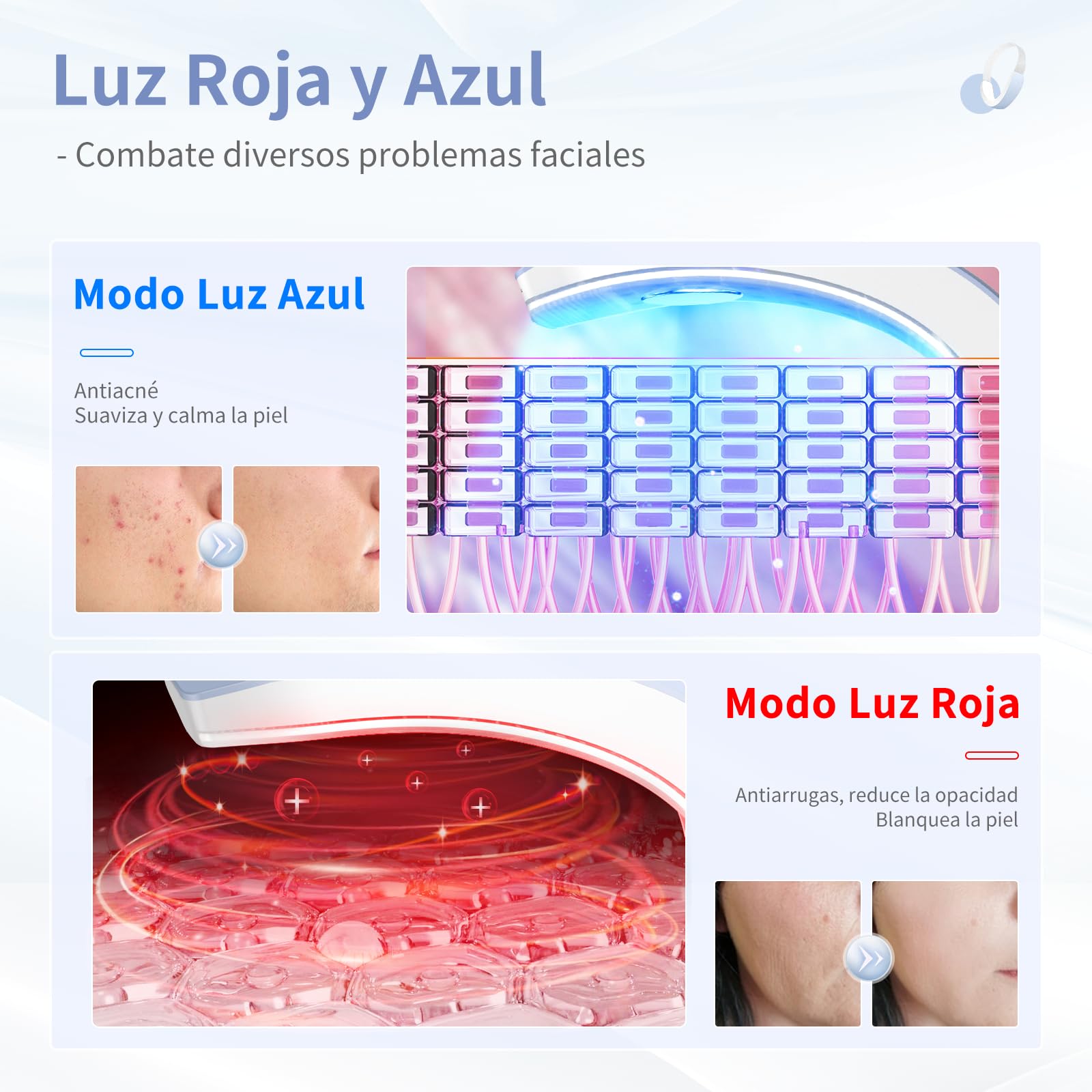- 36 luces LED de belleza: Este masajeador facial está equipado con 36 luces LED de belleza bicolor, rojas y azules. En el modo de luz roja, tiene efectos antiarrugas, mejora el tono de la piel e ilumina la piel. Promueve la producción de colágeno y restaura la elasticidad de la piel. En el modo de luz azul, la tabla de raspado puede aplicar descargas eléctricas para limpiar la piel, combatir el acné, inhibir la inflamación y suavizar la piel.