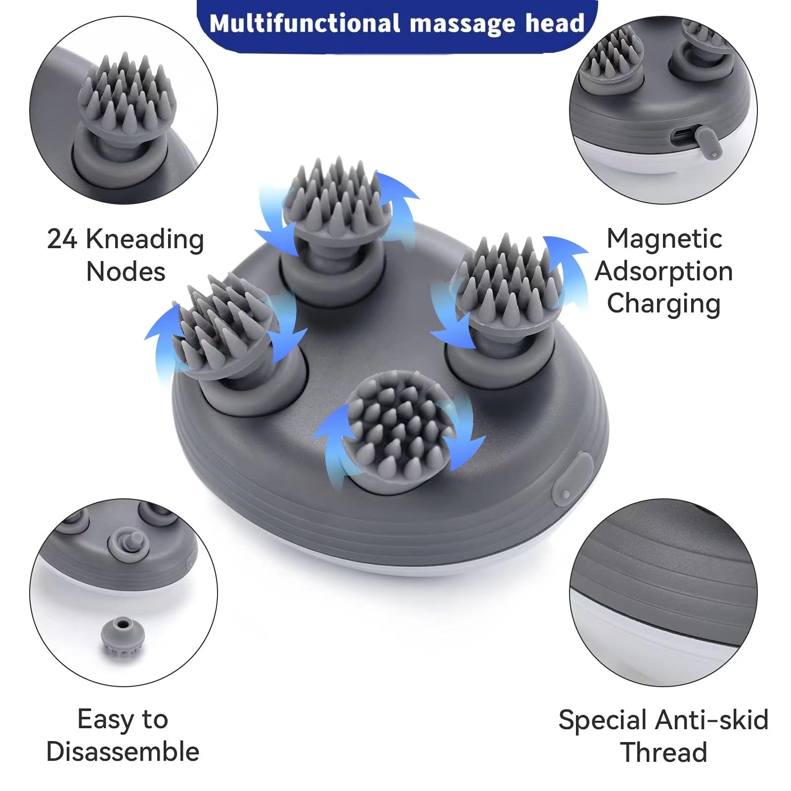 - 【Waterproof and Skin-friendly】IPX7 diseño impermeable, uso húmedo y seco, disfrute del masaje del cuero cabelludo y otras partes del cuerpo en cualquier momento y en cualquier lugar.Los 4 cabezales de masaje amasadores de silicona son muy suaves y no dañan la piel.