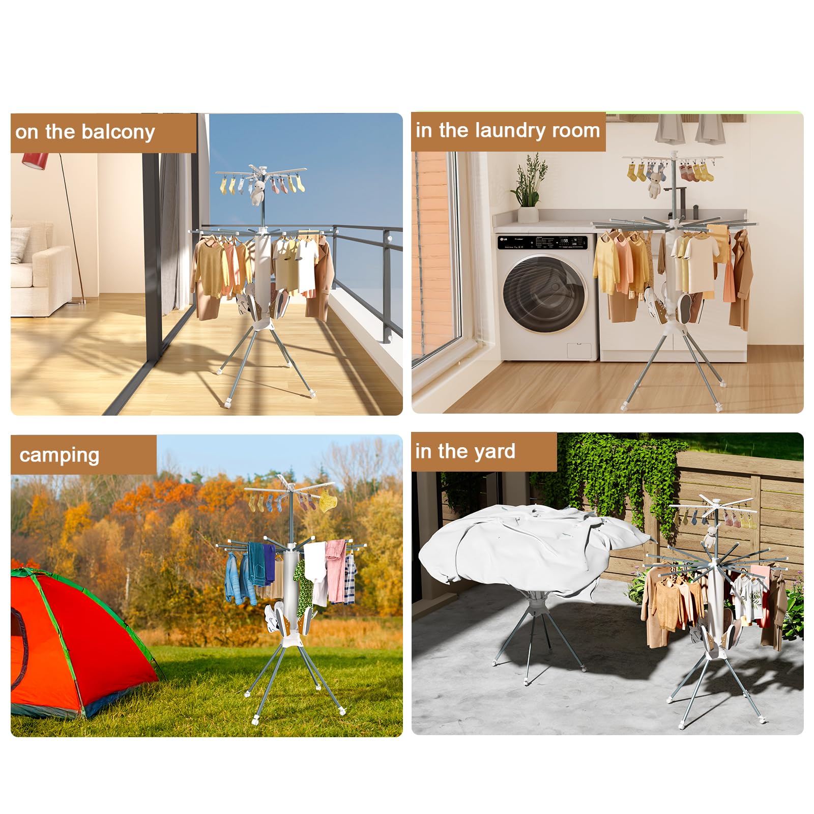 - Plegable y fácil de montar: este innovador tendedero adopta un diseño portátil y plegable. No se necesitan herramientas para el montaje y se puede desplegar en 1 minuto. Cuando no lo necesite, el soporte y la barra de secado de ropa se pueden plegar en el tubo y ocupar un área pequeña y ahorrar espacio. Este estante de secado para ropa es muy adecuado para casas compactas, caravanas, camping o viajes al aire libre
