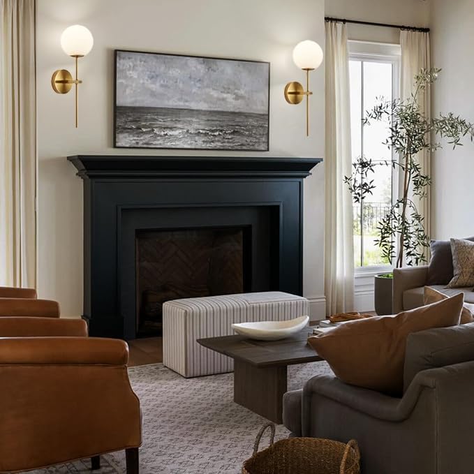 Lámpara de pared inalámbrica con cuerpo de latón y pantalla de globo de vidrio esmerilado lechoso que crea un ambiente cálido y suave, perfecto para cualquier espacio moderno o vintage.