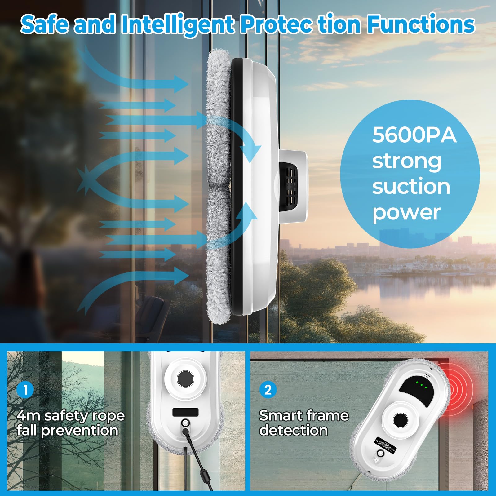 - 🛡️ 【Máxima Seguridad – Protección Avanzada】 Equipado con un sistema de detección de bordes y una cuerda de seguridad reforzada de 4 metros, este Robot Limpiacristales detiene su funcionamiento automáticamente ante cualquier riesgo de caída. En caso de corte de energía, mantiene la succión durante 20 minutos, ofreciendo seguridad total, ideal para apartamentos en altura.