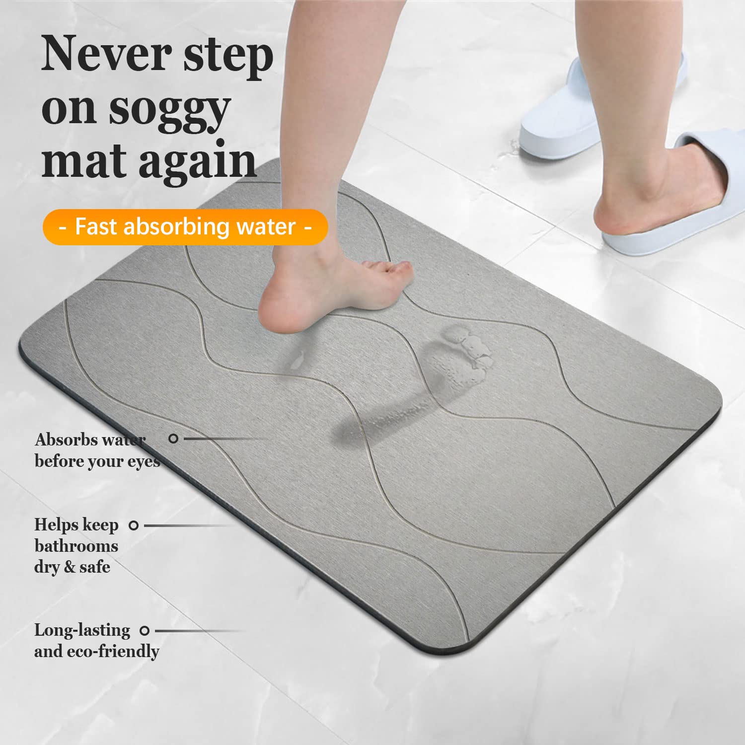 Fabricada con tierra de diatomeas natural, un material ecológico derivado de plancton fosilizado. Absorbe el agua de inmediato y la evapora en segundos, dejando el suelo seco y seguro. -